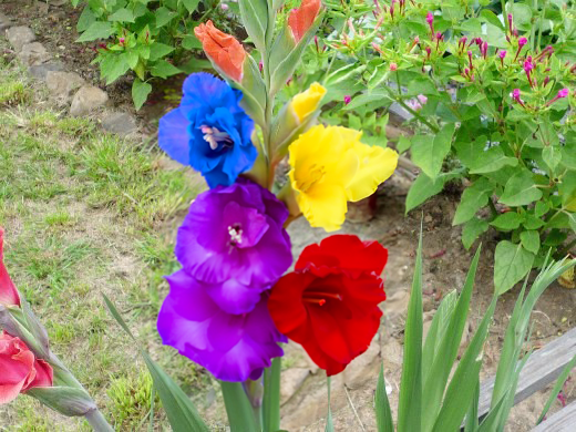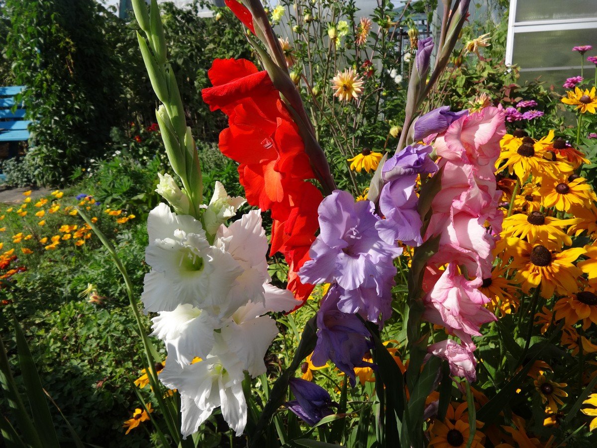 Висока ніжка гладіолуса Рейнбоу дозволяє висаджувати поряд низькорослих компаньйонів.